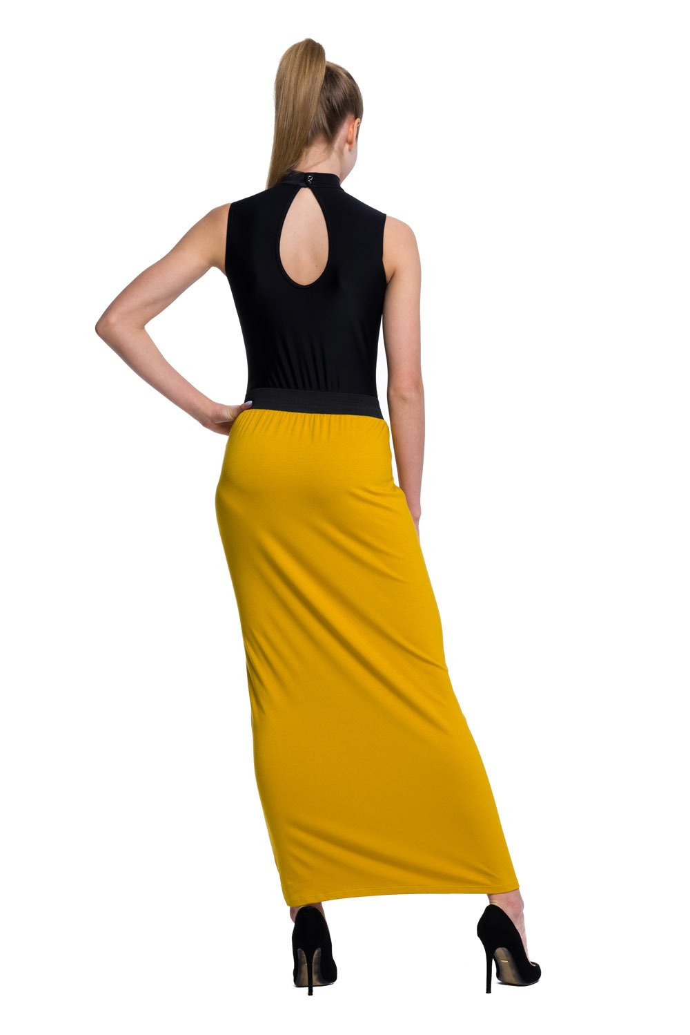 Body bez rukávů s ozdobným rozparkem na zádech ve tvaru slzy. Golf se zapíná na zadní straně krku dvěma stiskacími cvočky. Body má snížené nohavice, takže zcela zakrývá hýždě. Model z matné italské lycry.
