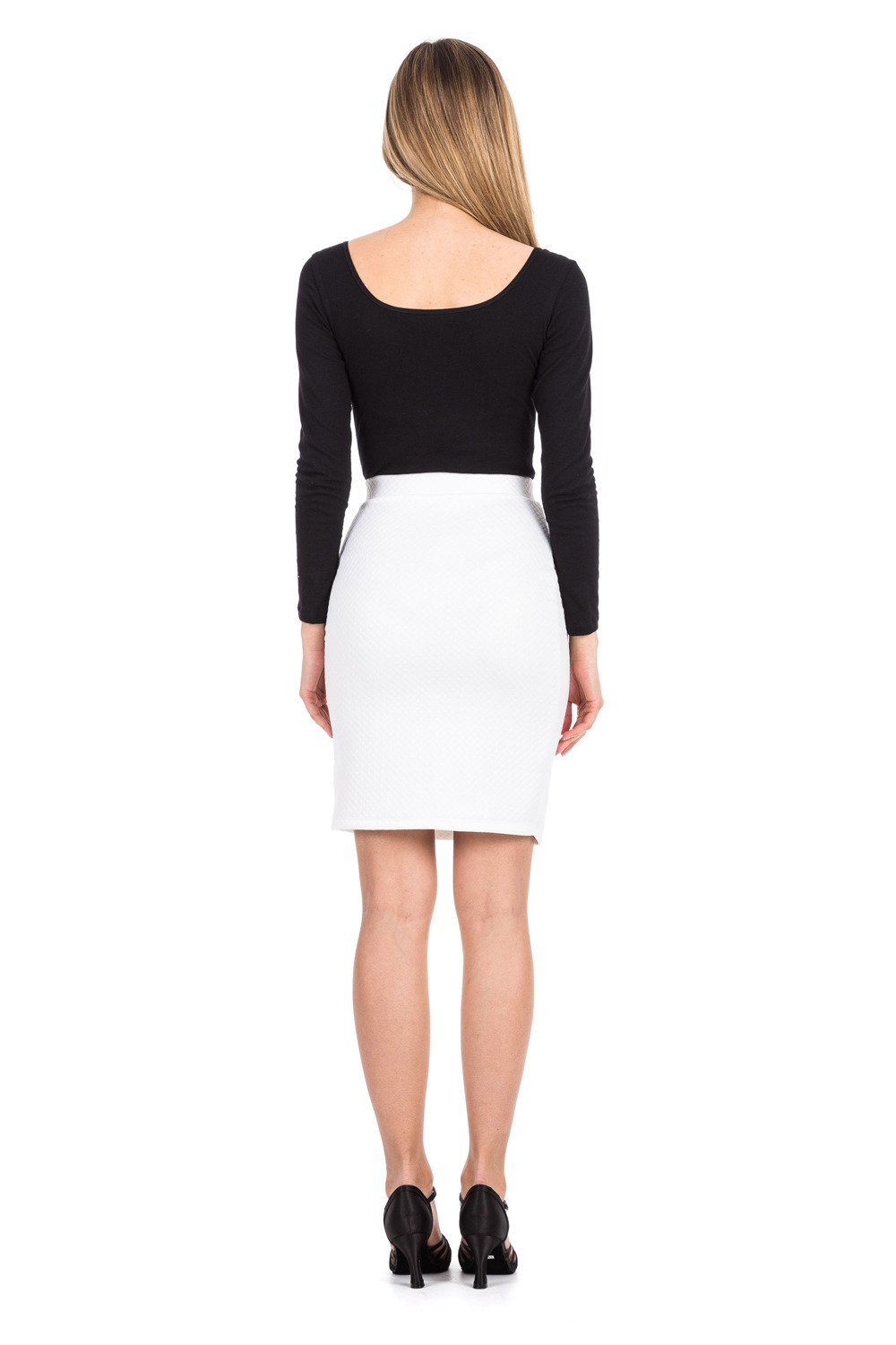 Předmětem aukce je vypasovaná tužková sukně MIDI. Sukně je vyrobena z módního prošívaného úpletu [100% polyester] - je příjemná na dotek a přizpůsobí se siluetě těla.