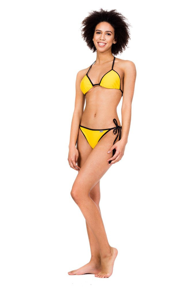 Podprsenka postavená na principu kontrastu - žlutá barvy s klasickou černou barvou kolem něj. Trojúhelníkové žluté košíčky jsou obklopeny černým lemováním. Ramínka se zavazují za krkem a obvod na zádech. Kostým je podšitý další vrstvou tkaniny, aby neprosvítala i za mokra. Složení 80% polyamid, 20% lycra.
