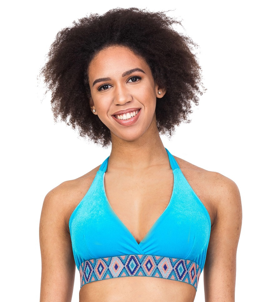 zapíná se za krkem a pod prsy je zajištěna vzorovanou barevnou gumičkou. Vnitřní strana košíčků je vyztužená