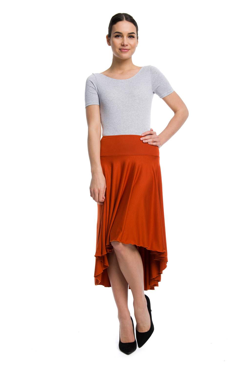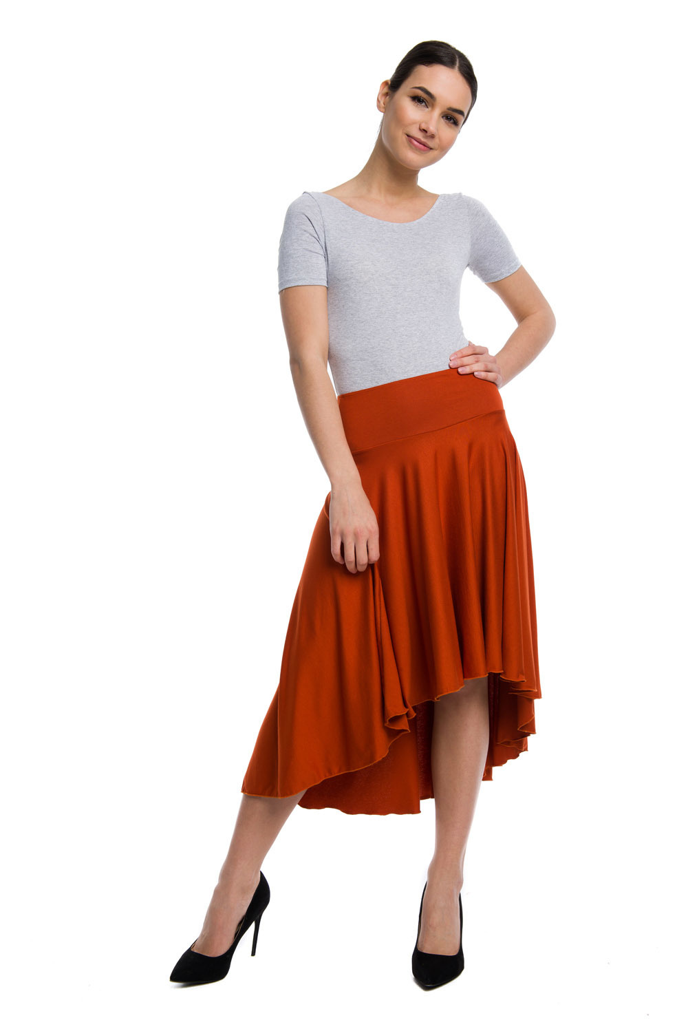 Asymetrická sukně - vpředu kratší, vzadu delší. Vzor celého kruhu. Zarámováno na konci. Zvýšený pas, který dodává celé siluetě štíhlost. Pásek s jemnou gumou pro podporu sukně v pase.