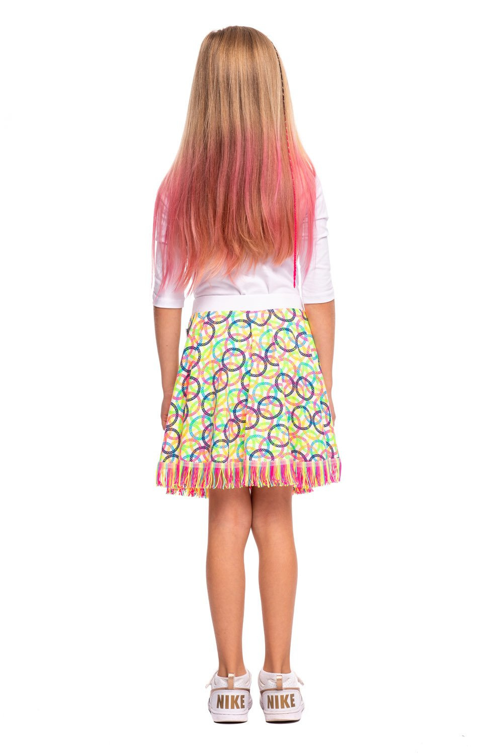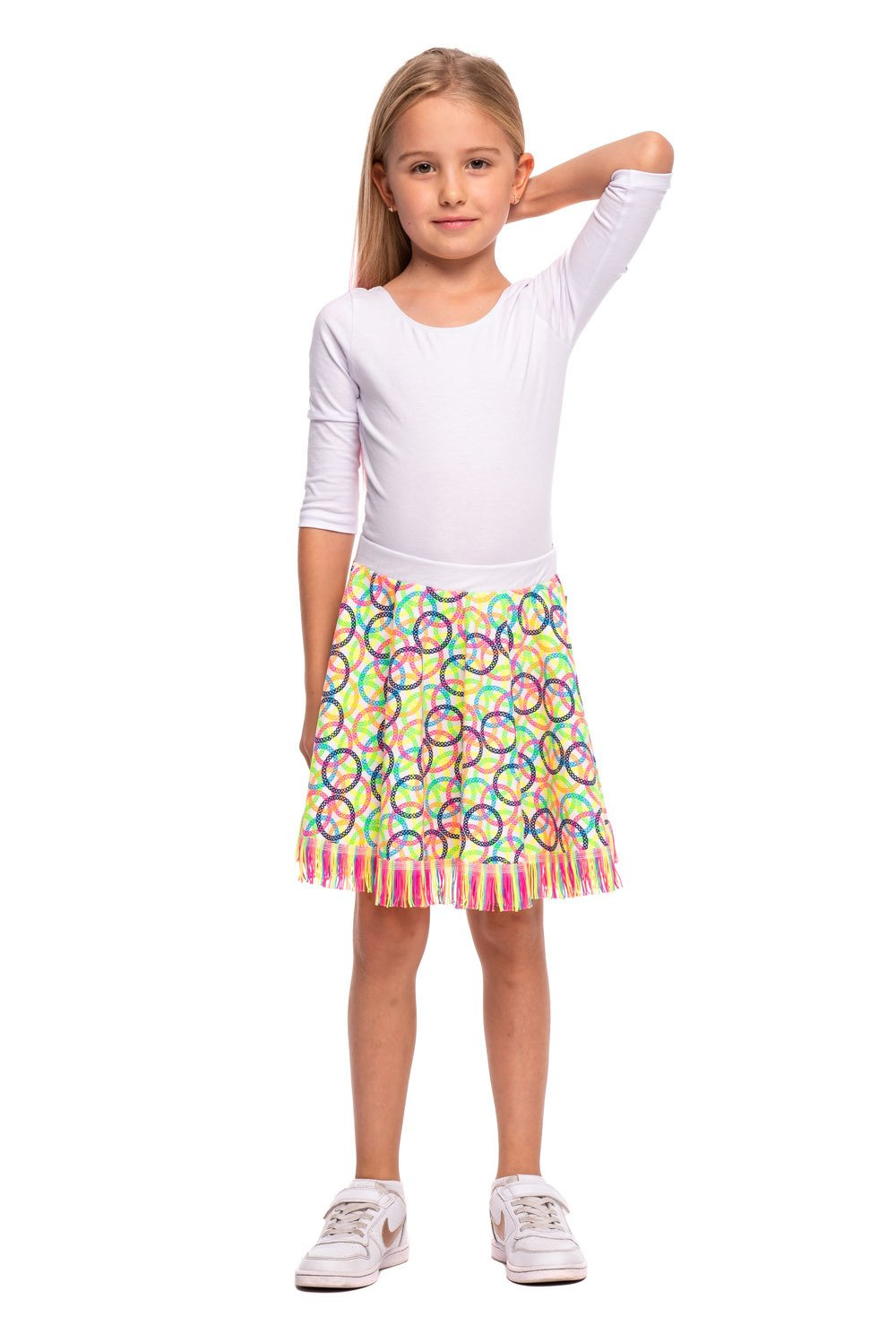 Kruhová sukně se střapci je v pase zakončena gumou všitou do sukně. Sukně je ve spodní části zakončena pestrobarevnými střapci, které dokonale ladí se vzorem na látce - pestrobarevné kruhy. Sukně je vyrobena z plného kruhu.