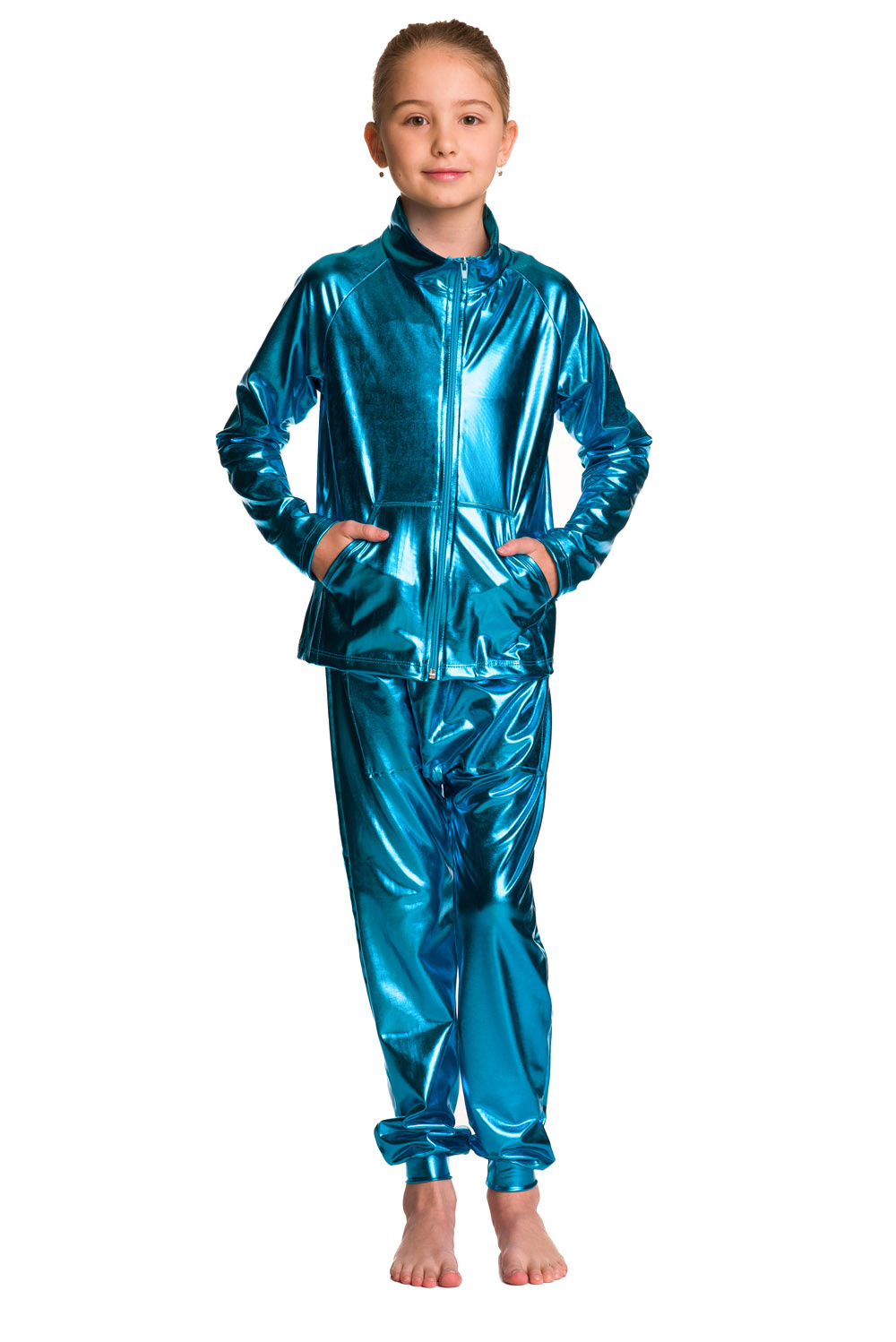 Metalická třpytivá mikina s dlouhými rukávy, stojáčkem, zipem a kapsami na drobnosti tyrkysová